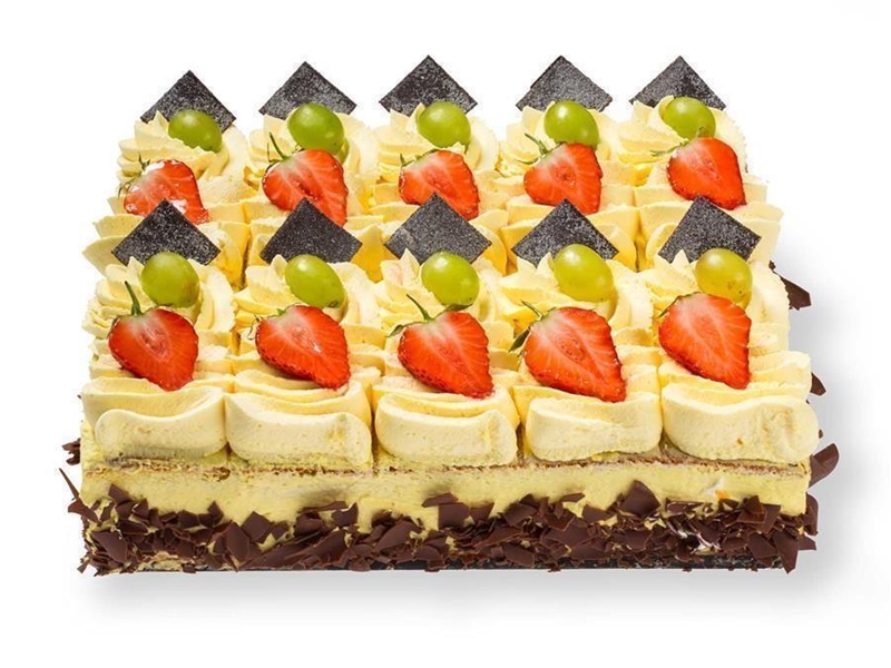 Een heerlijke advocaat slagroom taart afgewerkt met chocolade, belegd met fruit en chocolade.