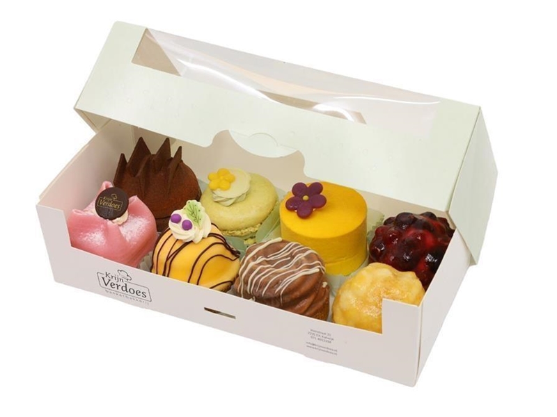 Luxe gebakjes: frambozencarré, pistache macaron, caramello, citroentartellette, appelfrisgebakje, redvelvetcake, advocaatslofje, bosvruchtengebakje.