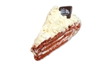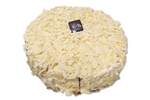 Taartje van heerlijke rode cake, gevuld met laagjes creemcheesefrosting met eromheen witte chocolade schaafsel.